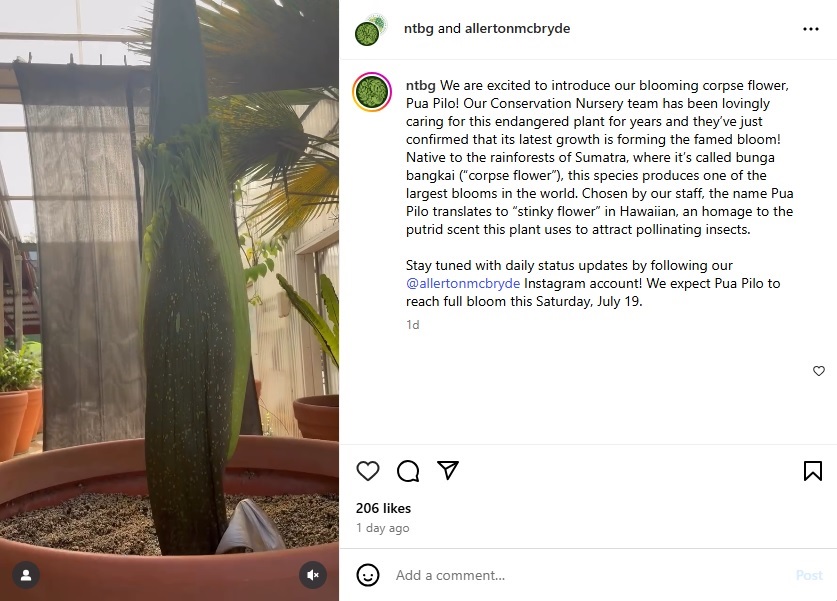 Visitors can see Pua Pilo on NTBG’s Best of Both Worlds tours at their South Shore Gardens while the bloom lasts. For those who can’t make it in person, NTBG is sharing daily updates on Instagram via @allertonmcbryde, including photos and behind-the-scenes details.