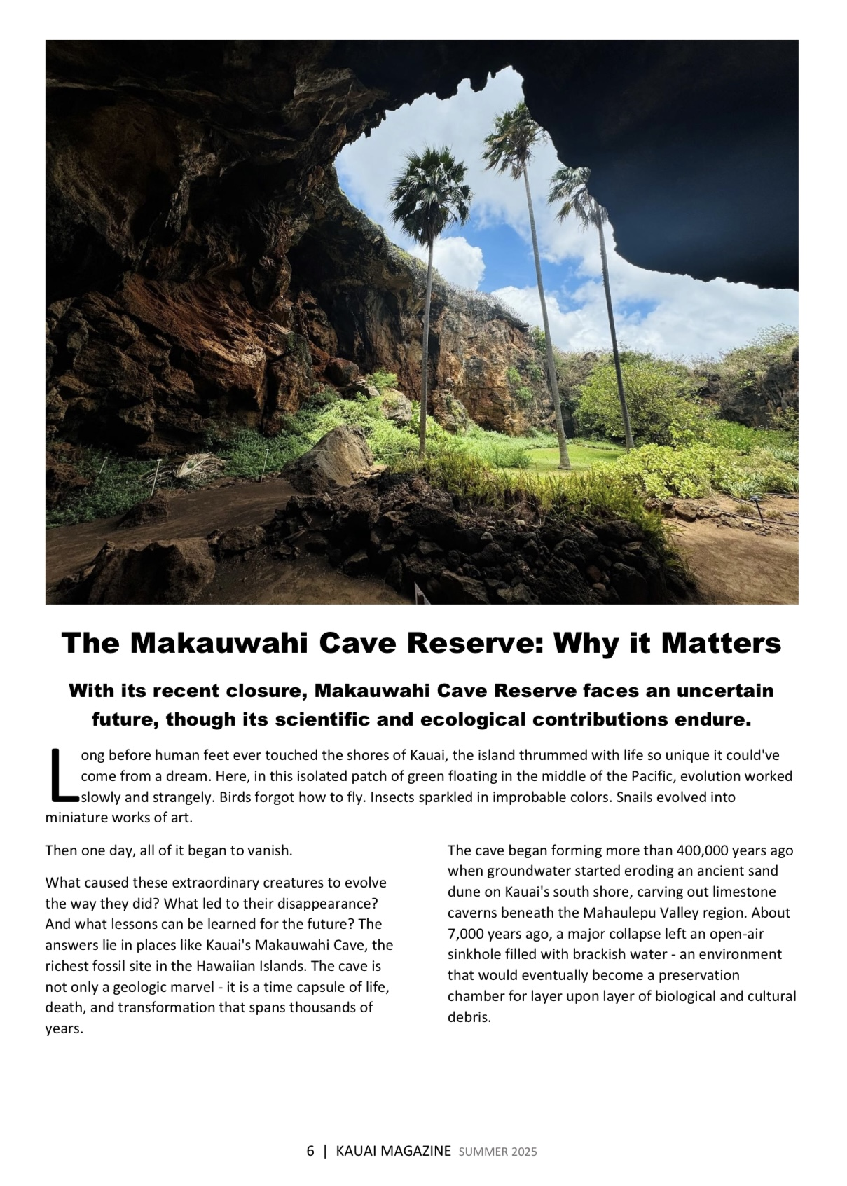 Welcome to the Summer 2025 issue of Kauai Magazine, where we take you behind the scenes on Kauai with our expert and in-depth knowledge of the island. In this issue we interview Dr. David Burney of the recently-closed Makauwahi Cave Reserve, brave the bumpy road to powerful Polihale Beach, talk with the Kauai Mermaid Tara Coyote, hike up the Okolehao Trail for a birds-eye view of Hanalei, meander through Smith’s Tropical Paradise with the peacocks in Wailua, try one of Hawaii’s most iconic foods at The Musubi Truck, sit down with artist Kimberly Kirk, and much more!