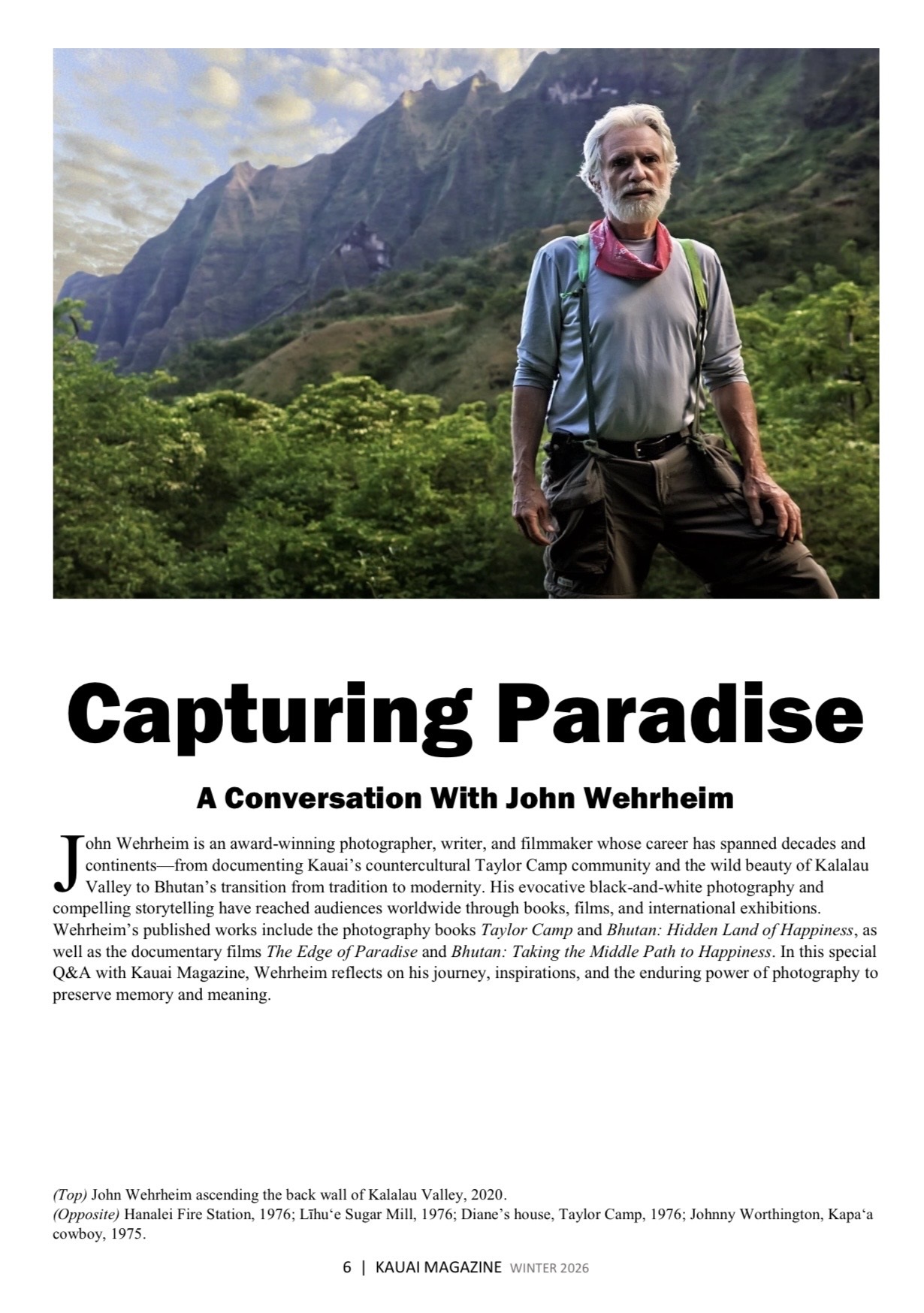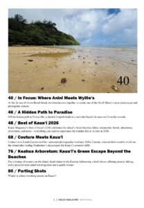 Welcome to the Winter 2026 issue of Kauai Magazine, where we explore the island through a deeper, more thoughtful lens during one of Kauai’s most magical seasons. In this issue, award-winning photographer John Wehrheim reflects on a lifetime spent documenting landscapes, communities, and cultural change. We wander the streets and shorelines of Hanalei Town, uncover hidden coastal paths and photogenic corners of the North Shore, and head inland to the peaceful trails and shaded picnic grounds of Keahua Arboretum. Couture icon Louda Larrain discusses her Green Acres-style leap from Manhattan’s sophistication to Kauai’s wild beauty. You’ll also find our “Stay Here, Not There” guide, highlighting smarter places to stay across the island, along with the Best of Kauai 2026, our definitive celebration of the island’s best beaches, hikes, restaurants, hotels, attractions, and adventures. From creative lives reimagined on Kauai to whale-watching season along the coast, this winter issue captures the people, places, and moments that make the Garden Isle unforgettable.
